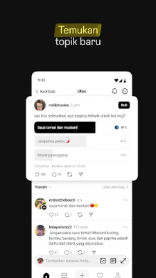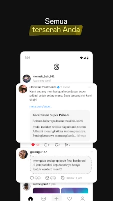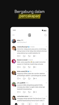 Di **Threads**, anda tidak sekadar memerhati; anda adalah sebahagian daripada perbualan. Berikan balasan yang bermakna, luahkan reaksi anda terhadap komen yang mencuit hati atau maklumat berharga, dan temui kumpulan anda dalam komuniti yang bersemangat. Peroleh inspirasi dan pengetahuan daripada kebijaksanaan ramai, pemimpin pemikiran, dan pakar industri, sama ada anda mencari cadangan siri TV atau nasihat kerjaya. Jangan terlepas trend terkini atau acara langsung; sentiasa dimaklumkan melalui perbincangan dan pemberitahuan apabila profil kegemaran anda memulakan perbualan baharu. Pengguna juga mempunyai kawalan penuh ke atas pengalaman mereka. Sesuaikan tetapan privasi anda untuk mengurus siapa yang boleh melihat kandungan anda, membalas utas anda, atau menyebut anda. Akaun yang disekat di Instagram akan dipindahkan ke **Threads**, dan **Meta** memastikan garis panduan komuniti yang sama diguna pakai untuk memupuk interaksi yang selamat dan tulen untuk semua.