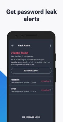 Privasi peribadi anda adalah keutamaan, dan AVG AntiVirus FREE 2026 for Android menawarkan beberapa lapisan pertahanan. Dengan ciri kunci aplikasi yang pintar, anda boleh melindungi aplikasi sensitif menggunakan PIN, corak, atau cap jari, menghalang akses tanpa izin. Ruang selamat Bilik Kebal foto yang disulitkan pula membolehkan anda menyembunyikan gambar-gambar peribadi daripada pandangan yang tidak diingini. Untuk pengalaman dalam talian yang lebih tanpa nama dan terjamin, perlindungan VPN disertakan, menyembunyikan jejak digital anda. Lebih penting lagi, anda akan menerima amaran serta-merta jika mana-mana kata laluan akaun dalam talian anda dikesan bocor, membolehkan anda bertindak pantas untuk melindungi identiti digital anda.