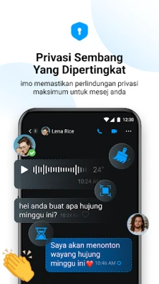 Privasi anda adalah keutamaan imo. Kami melindungi setiap perbualan dengan ciri-ciri canggih seperti Mesin Masa, Mesej Hilang, Sembang Privasi, Perisai Skrin, dan penyulitan hujung-ke-hujung. Anda mempunyai kawalan penuh untuk memadamkan mesej, menetapkan pemasa, dan menyekat tangkapan skrin, salinan, perkongsian, serta muat turun. Melangkaui sempadan bahasa, imo menawarkan terjemahan mesej segera, memudahkan interaksi silang budaya yang lancar. Perkongsian fail juga dipermudahkan; hantar apa jua daripada media hingga dokumen dalam kualiti asalnya, semuanya dilindungi oleh penyulitan hujung-ke-hujung untuk setiap pemindahan.
