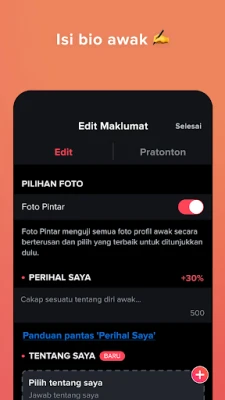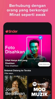 Membuka ruang untuk setiap jiwa, Tinder® adalah platform di mana anda bebas menjadi diri sendiri dan menemui individu yang paling sesuai dengan getaran anda. Sama ada anda mencari persahabatan, perkenalan baru, atau cinta sejati, kami menyokong anda untuk meluaskan lingkaran sosial dan percintaan anda. Kongsikan minat anda, gali keunikan padanan anda, dan mulakan perbualan menarik yang boleh mencetuskan bunga api. Dengan profil yang disahkan gambar, satu-satunya kejutan yang anda akan terima adalah senyuman di janji temu pertama. Malah, bersembang video secara santai dari keselesaan rumah anda membolehkan anda merasai keserasian sebelum bertemu muka. Jelajahi dunia, atau hanya di bandar anda – dari hiruk pikuk Kuala Lumpur, ke pesisiran Johor Bahru, hingga pesona bersejarah Melaka, Tinder membolehkan anda berhubung dengan orang-orang di sekeliling anda dan dari seluruh pelusuk dunia.